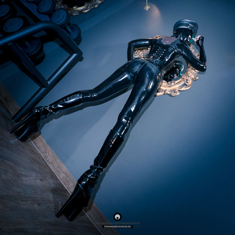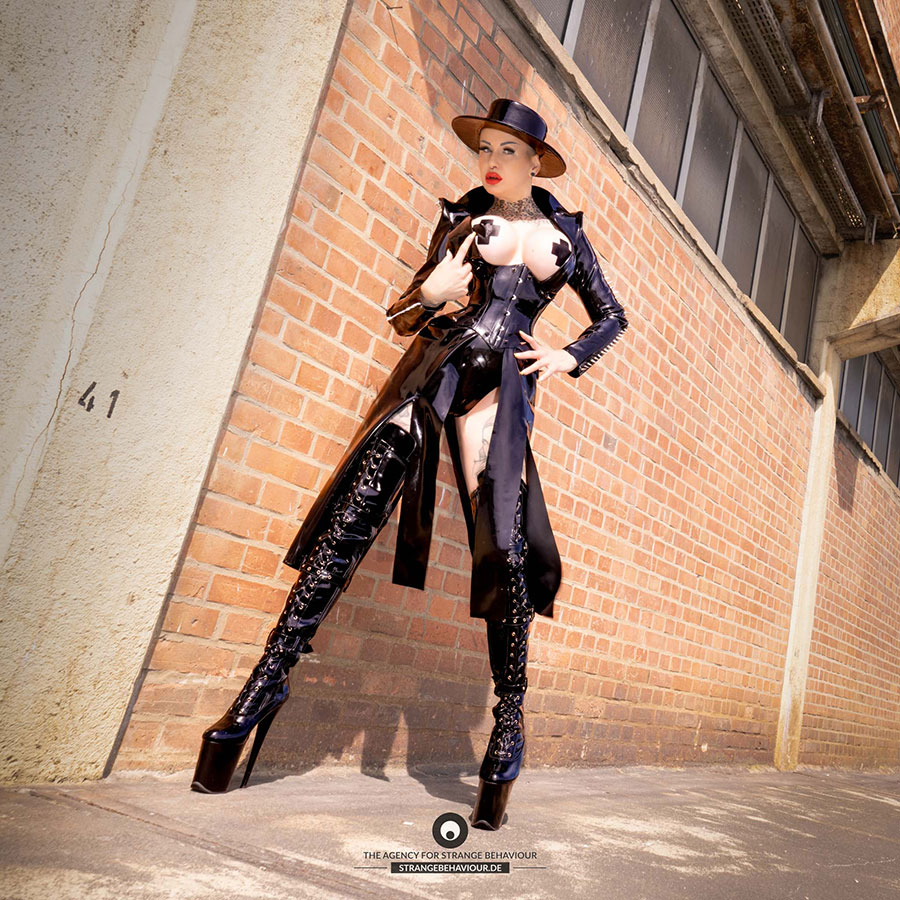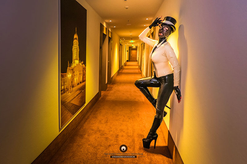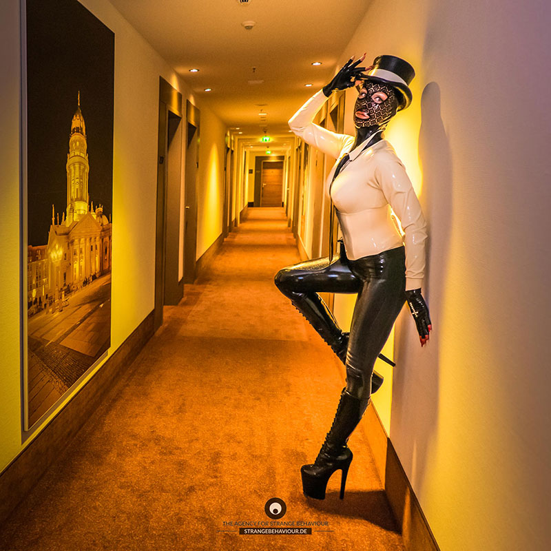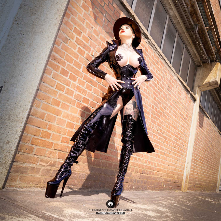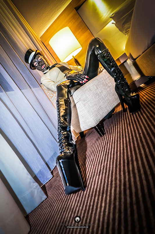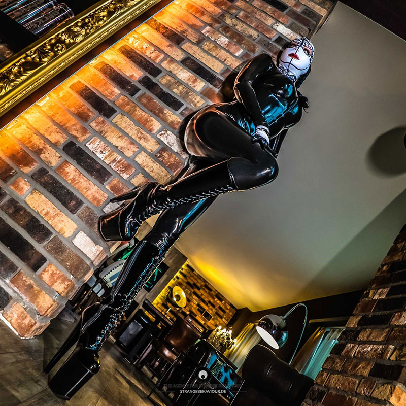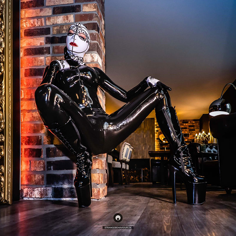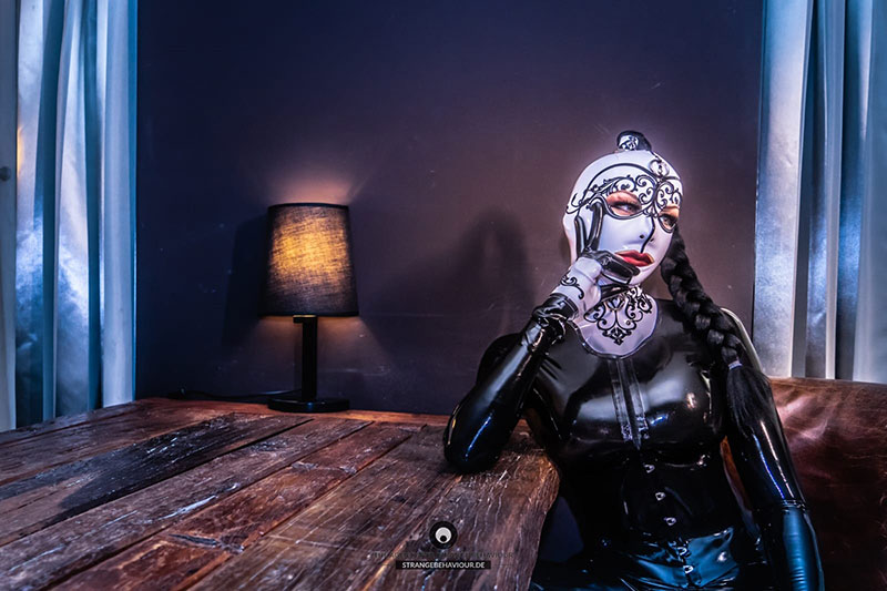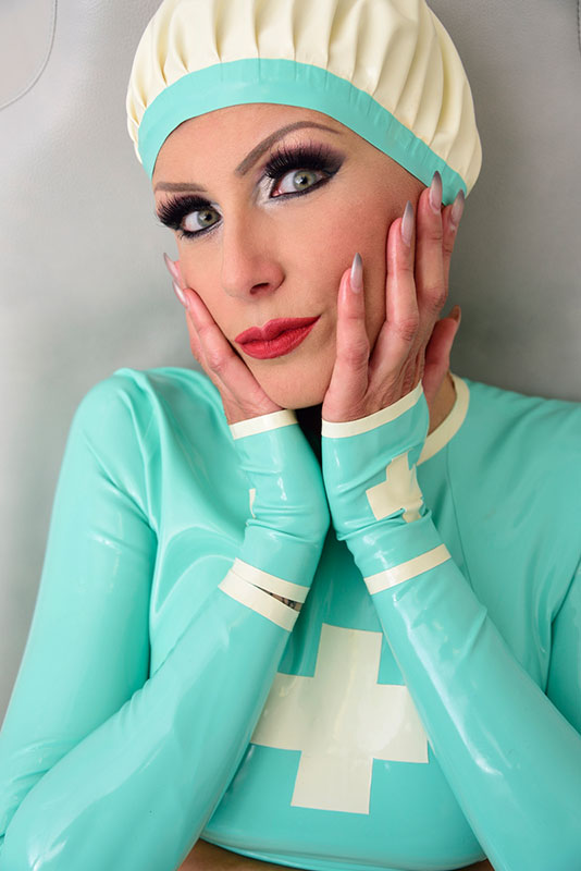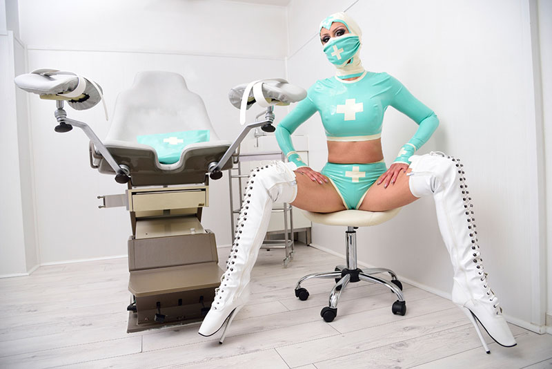 Alle Materialien wie Lack, Leder und Latex, alle Outfits für Rollenspiele, sowie alle Ausstattungen für Klinik und OP führe ich ständig mit mir und sind somit jederzeit und an allen Orten, an denen ich gastiere, vorhanden.
