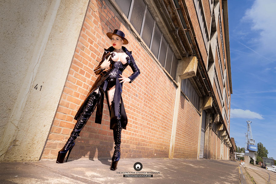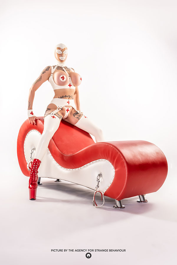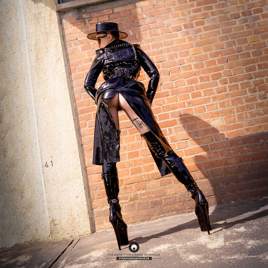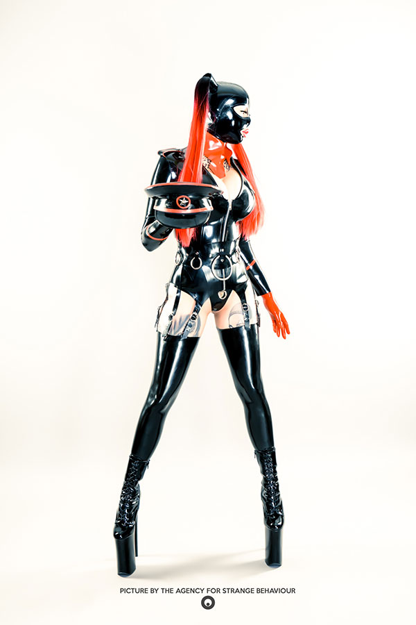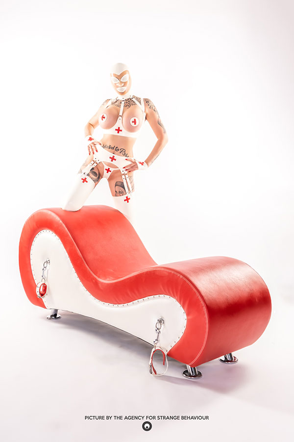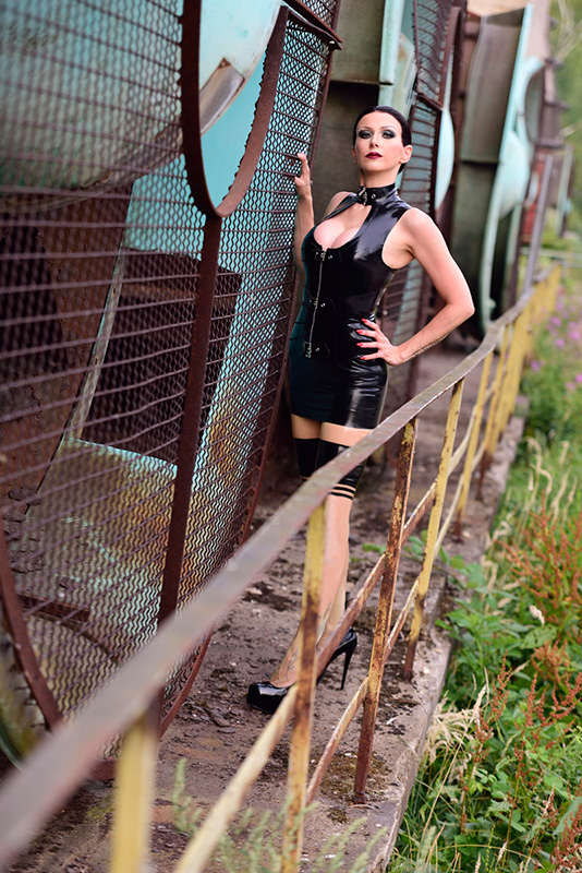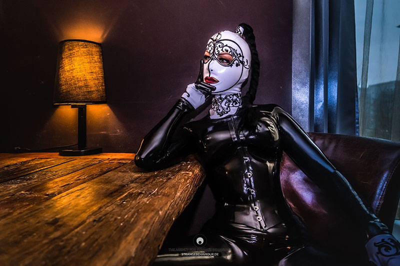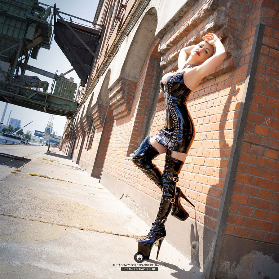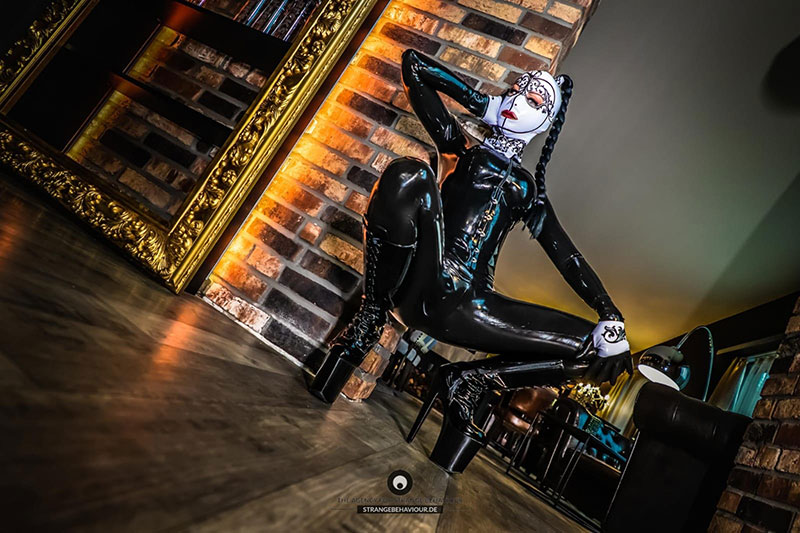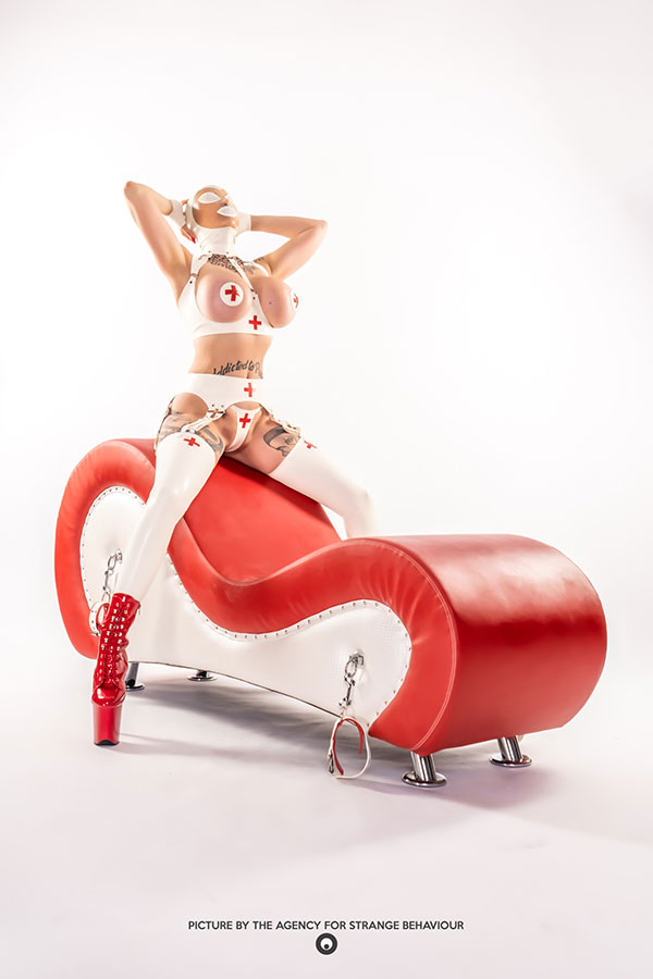 Alle Materialien wie Lack, Leder und Latex, alle Outfits für Rollenspiele, sowie alle Ausstattungen für Klinik und OP führe ich ständig mit mir und sind somit jederzeit und an allen Orten, an denen ich gastiere, vorhanden.