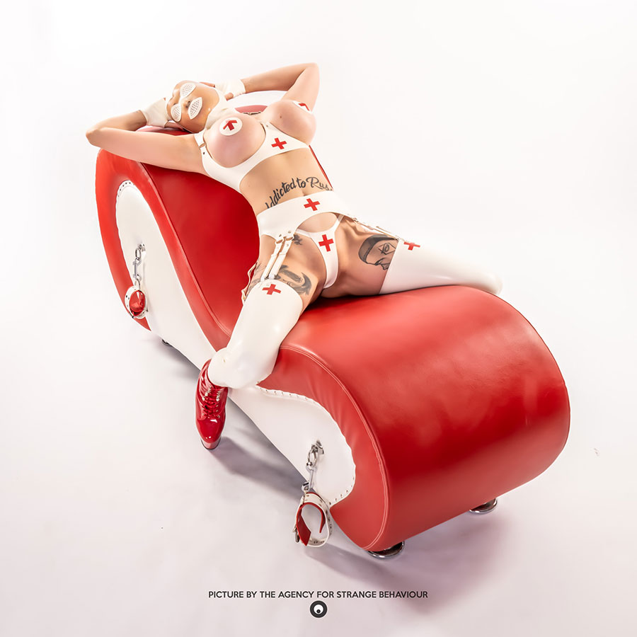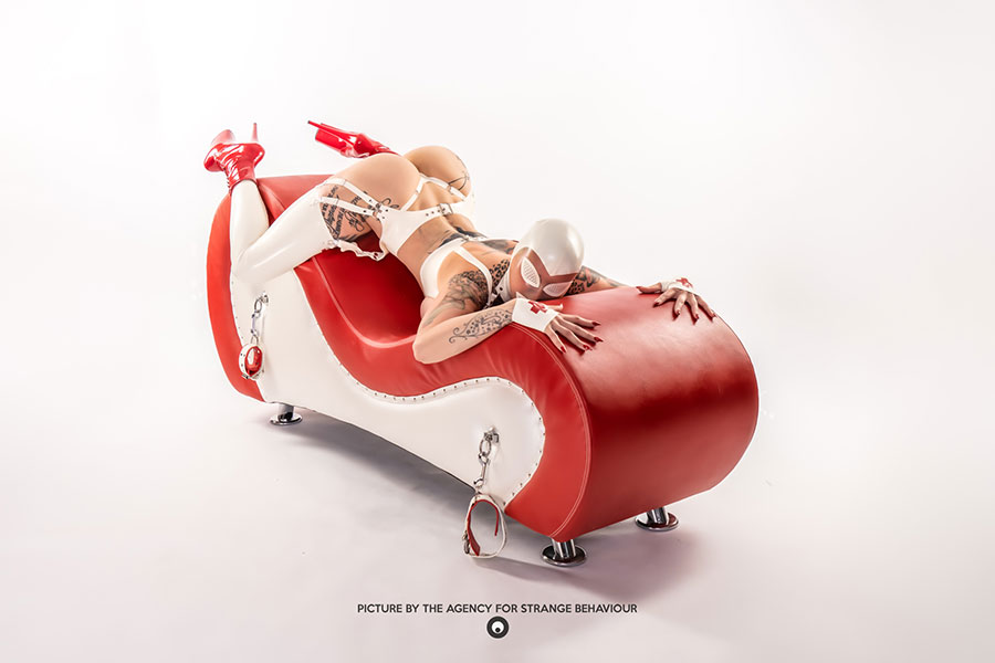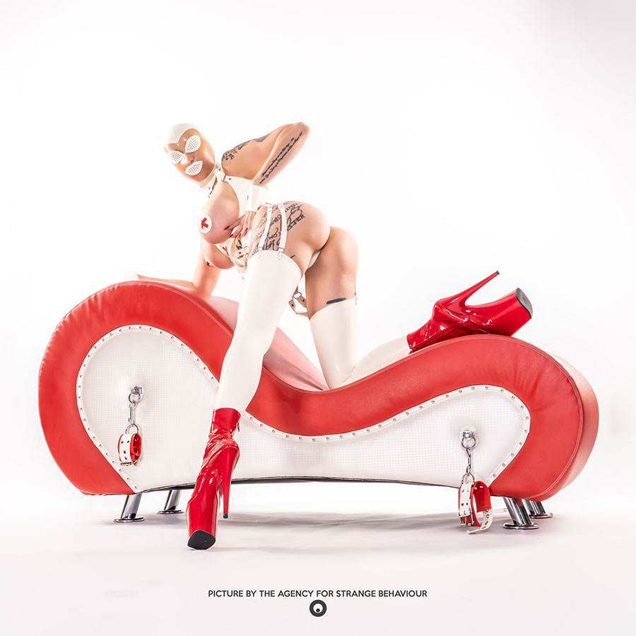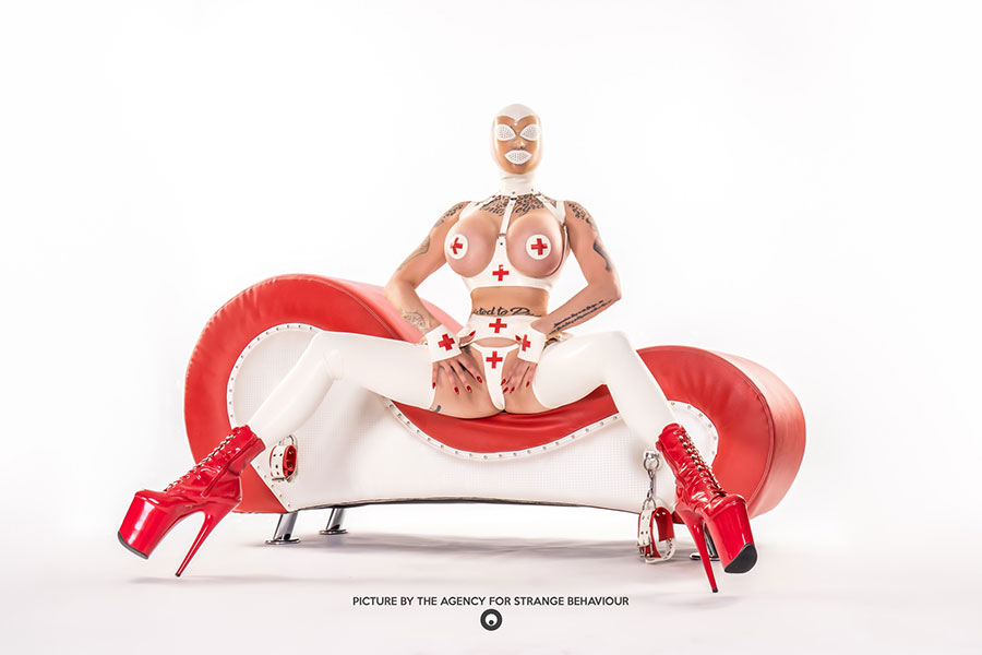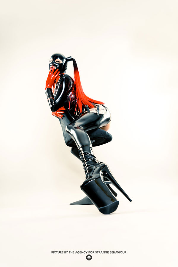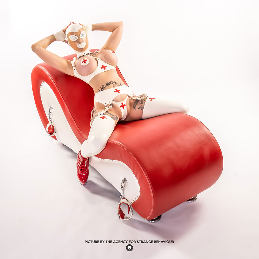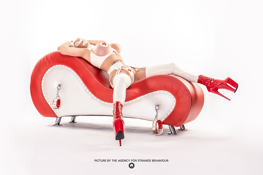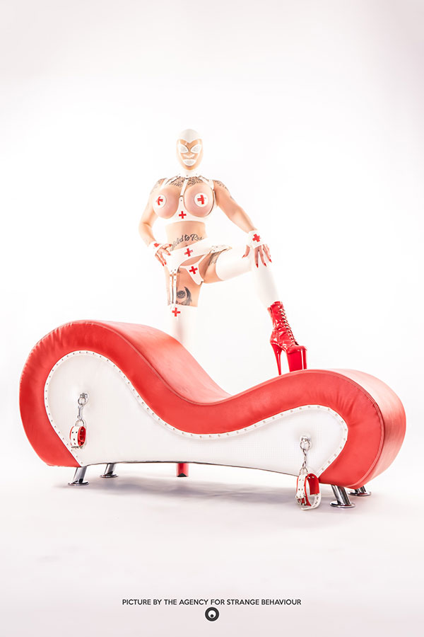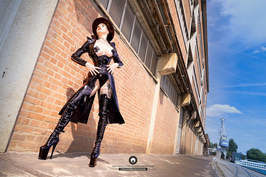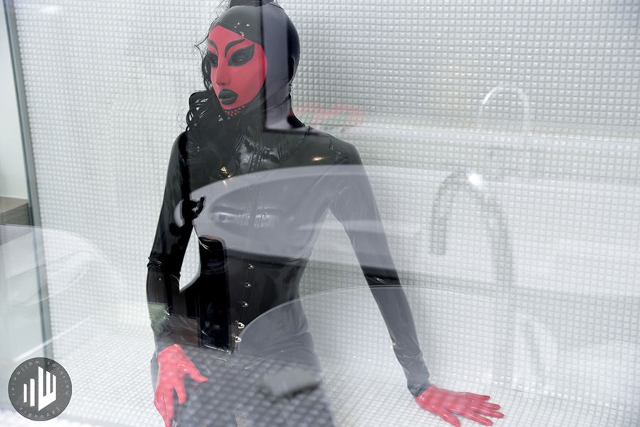Alle Materialien wie Lack, Leder und Latex, alle Outfits für Rollenspiele, sowie alle Ausstattungen für Klinik und OP führe ich ständig mit mir und sind somit jederzeit und an allen Orten, an denen ich gastiere, vorhanden.